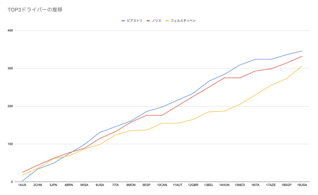⭐️トップのピアストリまで40点差。2位のノリスとの差は26点。2レースで逆転可能なラインまでにまで詰まってきた(マクラーレンがノーポイントの場合)